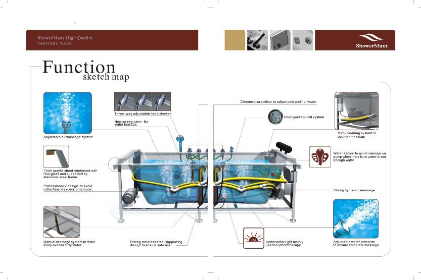 - Stevige acrylbad versterkt met fiberglass en een sterk ondersteunend onderframe van stainless staal om een veilig gebruik te garanderen.